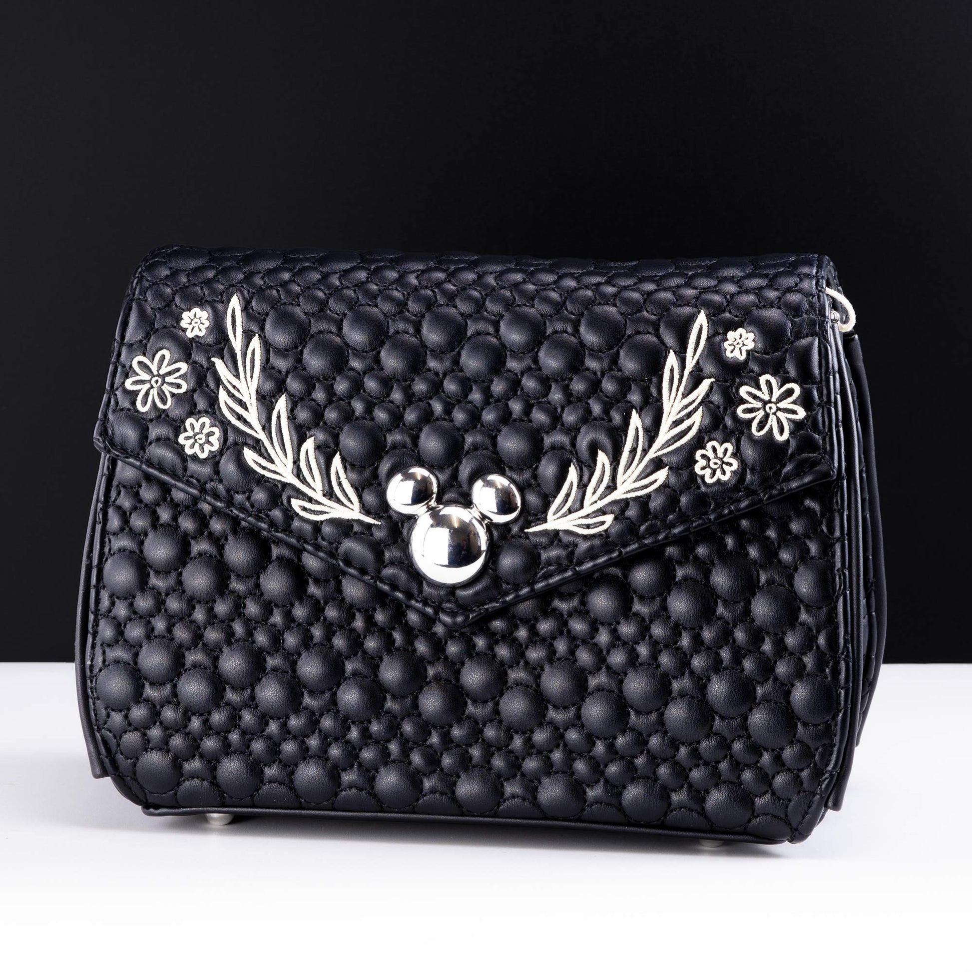 - Embroidered floral details and silver Mickey stud on flap